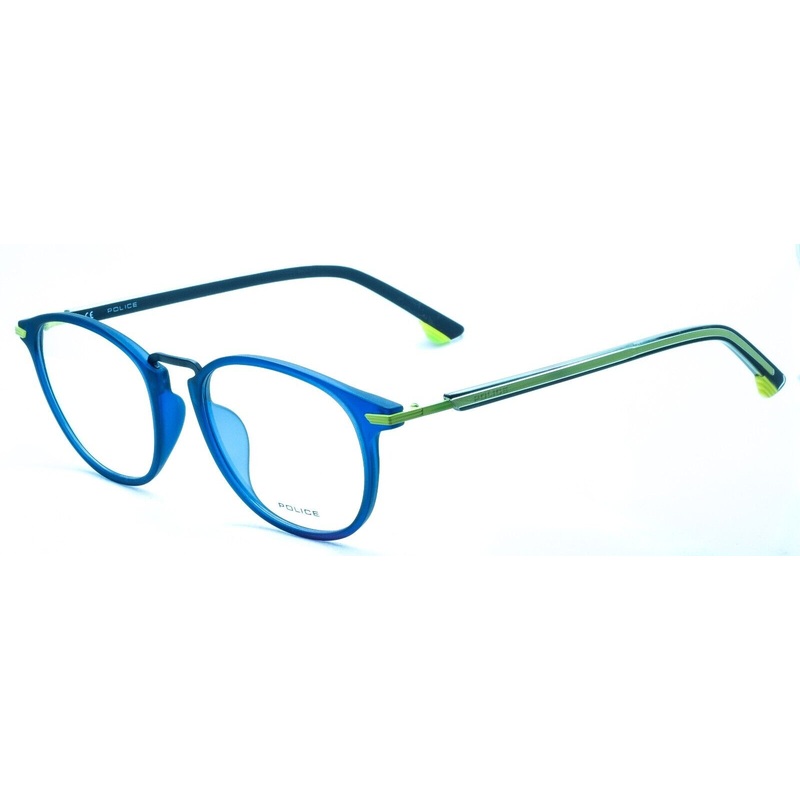 POLICE Full Rim Frames - 100% Authentic - DROP 4 VPL 558 COL. 0TA5Matte blue acetate framesPolished yellow metal arms with gloss transparent over matte black acetate coversBrand new - Never been wornLens Width = 49mmFrame Height = 45mmBridge = 18mmTemple (