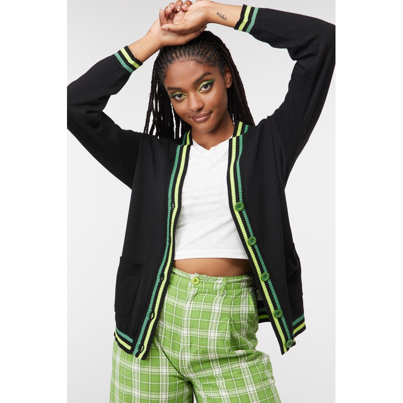 Boxy Cardigan- Contrats Colour At Neck, Hem And Sleeve Hem- Dropped Shoulder- Pockets On Front- V-Shaped Neckline- Button Closure At Front- Made From Soft Knitted Viscose And Cotton- Available In Black/Green Tea wears a size 8 height: 177cm, bust: 88cm, wa