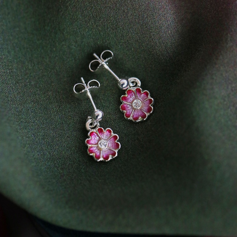 These Primula Scotica drop earrings in sterling silver each feature a single primula scotica flower hand-enamelled in Hot Pink enamel. The centre of each flower is hand-set with a cubic zirconia in our Orkney workshop.The beautiful and rare Primula Scotica