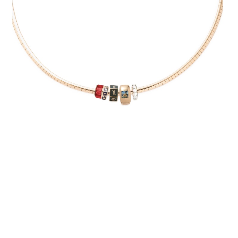 Handcrafted in 18k Yellow Gold, this Small Sleek Collar featuring Pave Diamond Heart Beat, Ruby Baguette Heart Beat, Swiss Blue Topaz Princess Cut Gemstone Heart Slide, Karma Heart Beat, and an Olive Custom Faceted Heart Beat makes the perfect and timeless layer to add to your story. The Custom Faceted Heart Beat is customizable with up to 6 letters.