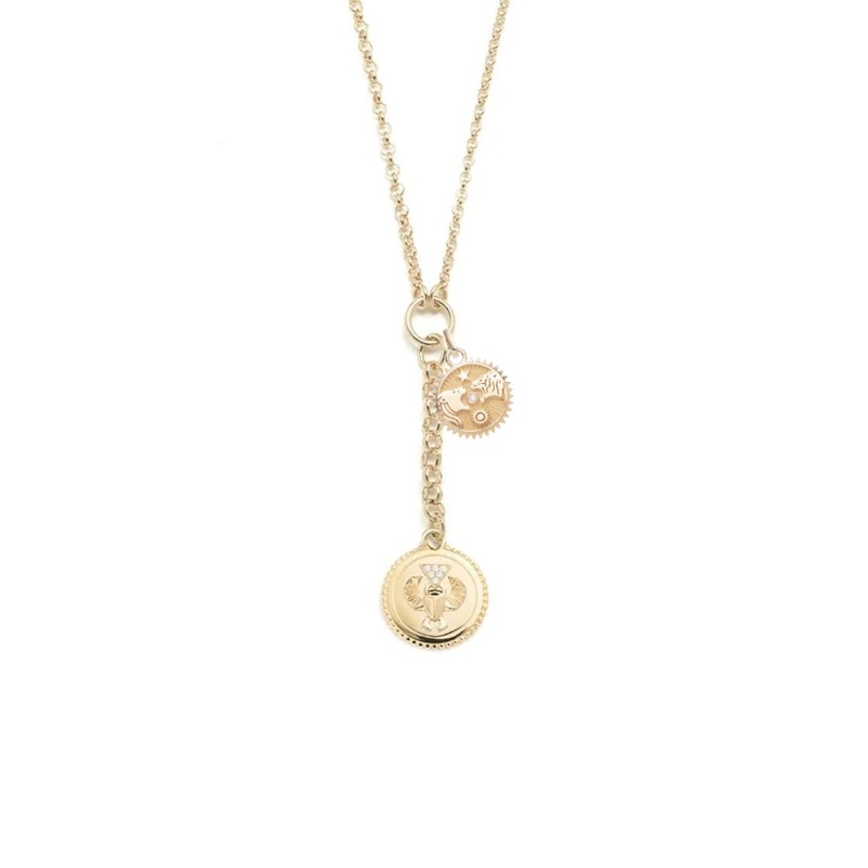 Handcrafted in 18-karat Yellow Gold, this Small Mixed Belcher Extension Chain Necklace symbolizes Protection. The Scarab is meant to shield the wearer…not from a malevolent outside source but from our own negative thoughts. The ones that say, you cant do it or something similar and prevent us from using our energy to build more productive and positive aspects of our lives. The Solar + Lunar Strength Medallion is a reminder that Strength is within. We all have it, but sometimes it wanes, and we need to call on it.