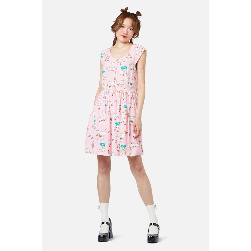 Printed Dress -Features ‘Puddle Duck’ All Over Artwork – Round Neckline – Bodice Centerfront Button Placket – Gathered Waist Skirt – Made From Viscose – Available In Pink