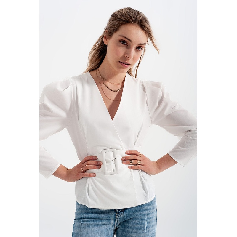 Puff Sleeve Wrap Front Top With Belt Detail In White