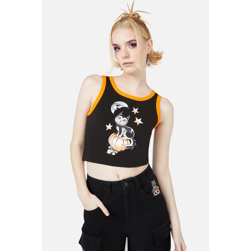 Graphic Tank- Fitted Shape- Cropped Length- Sleeveless Style- Round Neckline- Contrast Colour Neckline And Armholes- Placement 'Pumpkin Kitty' Artwork On Front By Artist Ella Mobbs- Available In BlackProduct Code: BGFY095