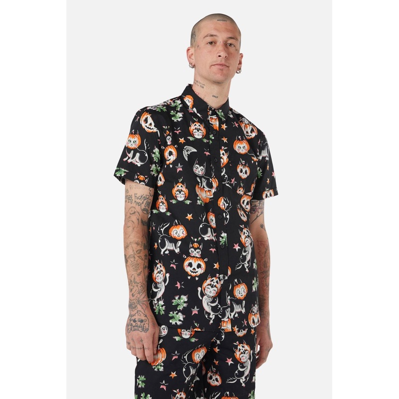 Graphic Shirt-Features 'Pumpkin Patch' Repeat Artwork-Short Sleeves-Button Front-Shaped Collar-Made From Cotton-Available In Black & WhiteProduct Code: BBFY031
