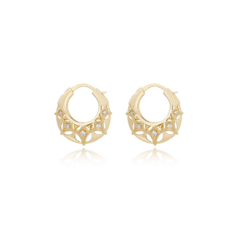 The Queen of Diamonds Small Brave Hoop Earrings are made in 18 carat yellow gold and feature white diamonds.These earrings are a reminder to be brave in going for what we want with open hearts. Difficulties can be overcome and it only makes us bulletproof