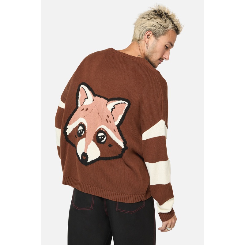 Patch Artwork Cardigan – Features Custom ‘Raccoon’ Emb Artwork Patches – Has Contrast Striped Sleeves – Button Front – Relaxed Fit – Soft Hand Feel – Made From Cotton – Available In Brown/Cream