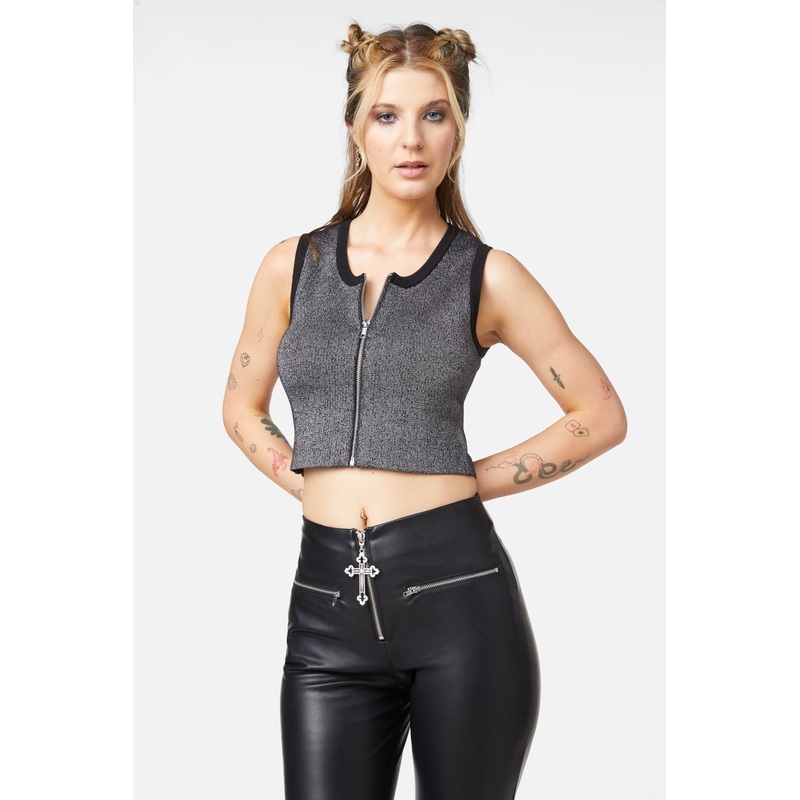 Fitted Vest Top- Round Neckline- Sleeveless Style- Zip Closure At Front- Made From Silvery Knitted Fabric- Available In Black/SilverProduct Code:DGFV360