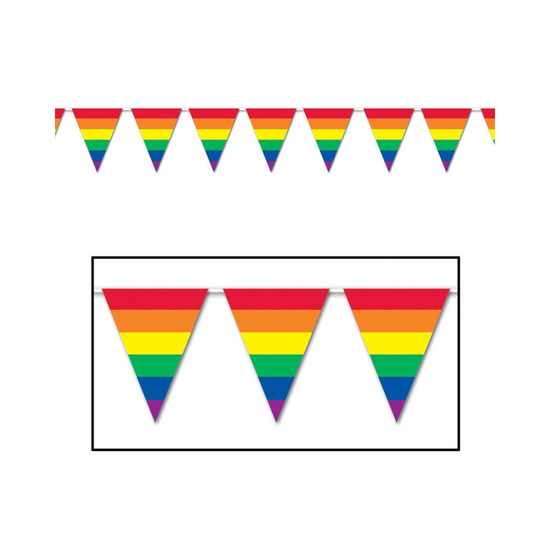 Mardi Gras time!Party in style with our range of Rainbow party accessories and decorations like this Rainbow Striped Pennant Banner in all the colours of the rainbow! Red and yellow and...you know how it goes! Measuring 25.5cm x 3.7m / 10in x 12ft and made