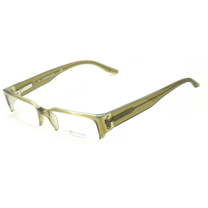 POLO RALPH LAUREN Half Rim Frames - 100% Authentic - 1878 FY8Gloss transparent green acetate frames and arms with raised Polo player logosPrecision spring hinges for a comfort fitNever been wornLens Width = 51mmFrame Height = 30mmBridge = 17mmTemple (Arm L