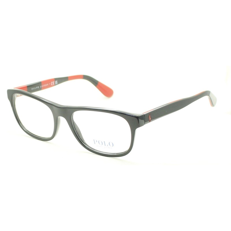 RALPH LAUREN POLO Full Rim Frames - 100% Authentic PH 2240 5001Gloss black acetate frames and arms with raised red POLO playersRed and black striped inner armsBrand new - Never been wornLens Width = 54mmFrame Height = 44mmBridge = 18mmTemple (Arm Length) =