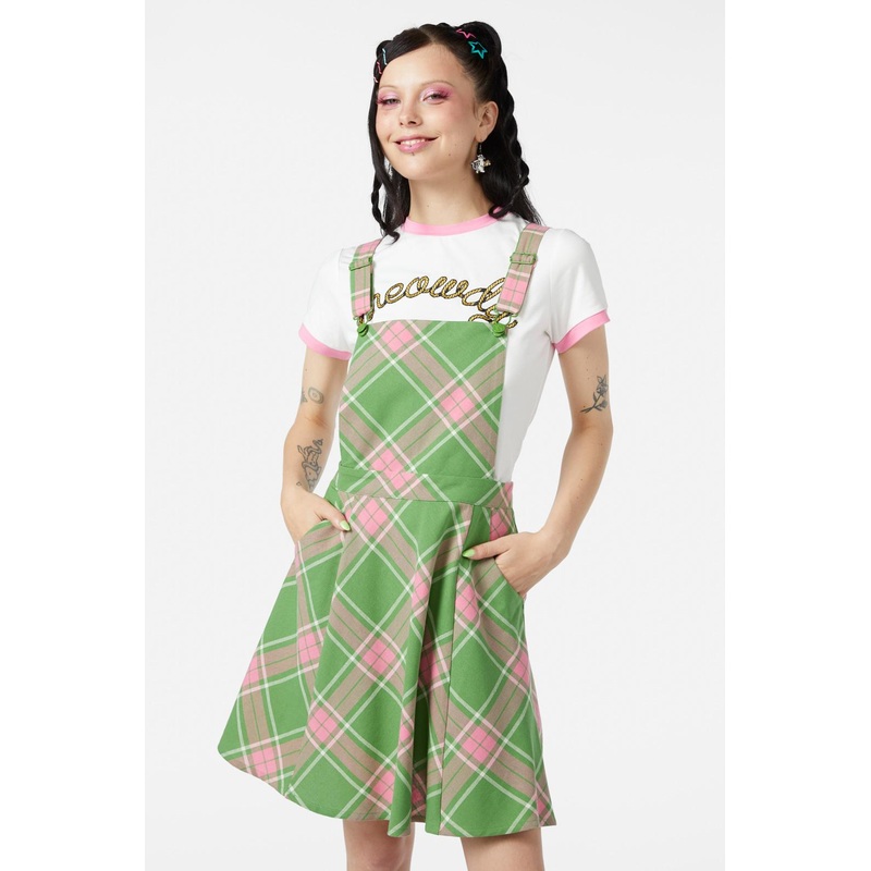 Colourful Pinafore- Adjustable Straps- Pocket On Front Bust- Fitted Waistband- Flares Style Skirt- Zip Closure At Back- Made From Cotton/Elastane Tartan Fabric- Available In Green/PinkProduct Code: DGFZ026