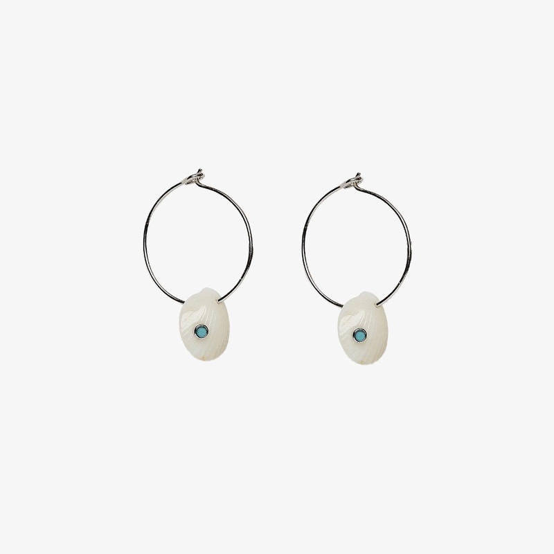 Our Real Shell Hoop Earrings bring the sea with you wherever you go. Featuring silver hoops with a dangling shell and a dainty turquoise crystal accent to refresh your seaside style.