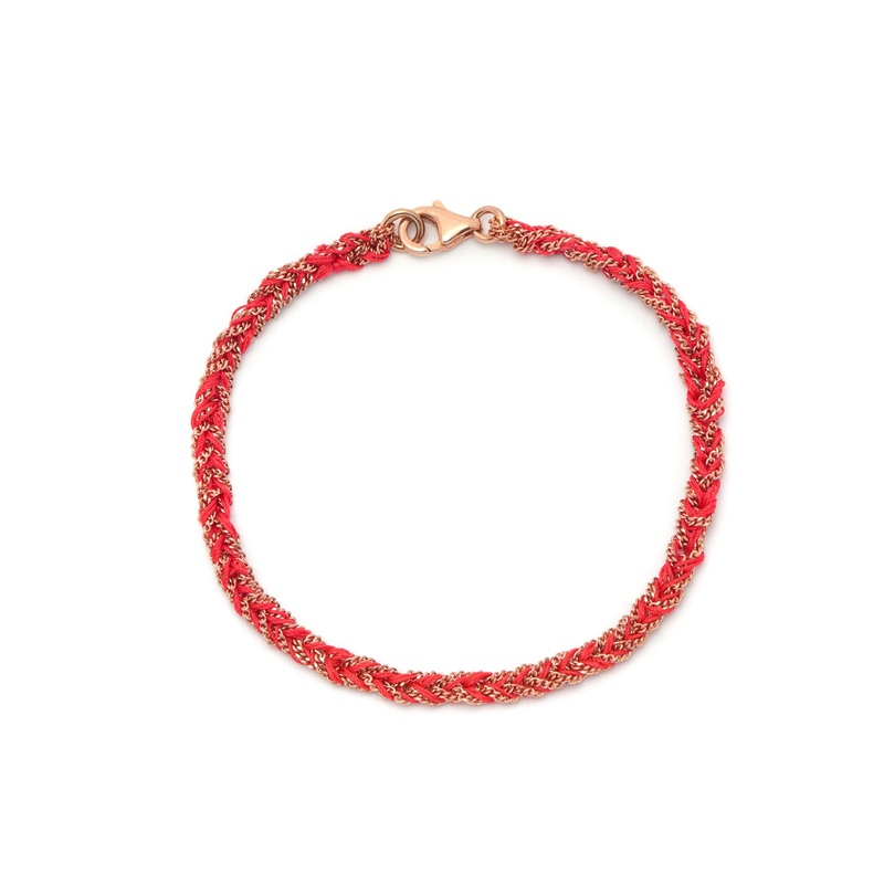 The Red and Gold Friendship Bracelet is inspired by the woven fabrics in Central America, and is hand woven on an Italian loom using a unique Florentine technique. It is braided from natural red silk thread and 18ct rose gold plated sterling silver chain,