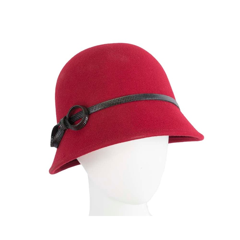 Unique bucket hat designed by Max Alexander. It features specially crafted shape where brim at the back is short to make for more comfortable wear.Made from red felt and dressed with black leather bow, this bucket hat is a perfect choice for your winter ou