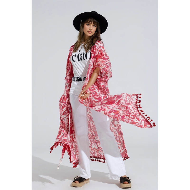 Complete with fringe trim details at the bottom, this kimono exudes casual elegance with a hint of boho-chic charm. Whether you’re lounging by the pool or strolling along the beach, this kimono is sure to keep you looking effortlessly stylish all summer long.