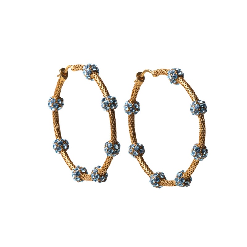 Part of Sonia Petroffs Lamu collection are these stunning Reef Earrings - Aqua.The textured gold hoops are reminiscent of the beautiful coral reefs found in the Lamu archipelago. Made of 24K yellow gold overlay, the sparkling Swarovski crystals reflect the