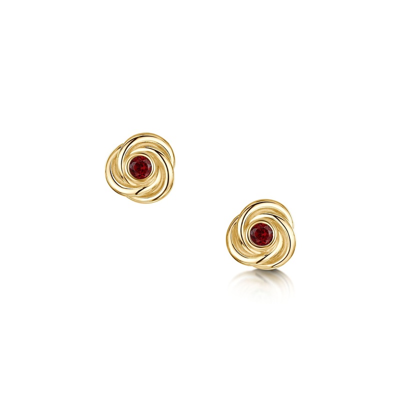 These Reef Knot stud earrings in classic 9ct yellow gold feature a tightly woven knot design and are enhanced with a 3mm garnet set by hand in our Orkney workshop.This elegant collection is inspired by the reef knot, a knot popular with generations of sail