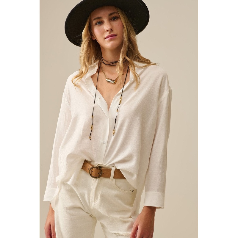 Effortlessly polished, this white button-down blouse is a modern essential with timeless appeal. Designed with a pointed collar and long sleeves, it features a unique double-layer hem that adds subtle texture and dimension to its clean silhouette. The ligh