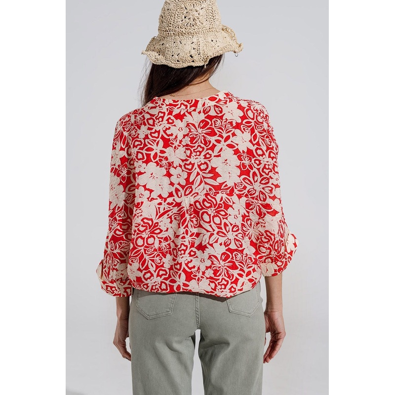 Relaxed Red Floral Print Blouse With Bell Sleeves