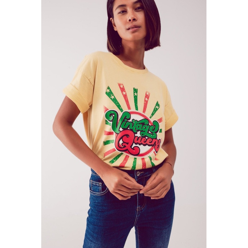 Relaxed T Shirt With Yellow Vintage Queens Graphic