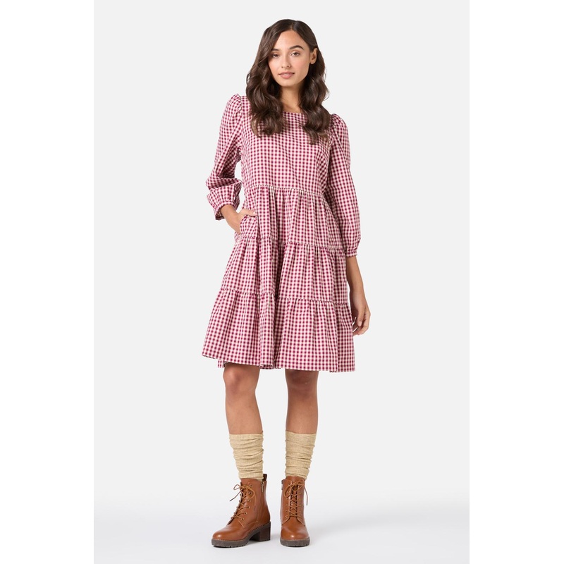 Long sleeve tiered smock dress featuring a sweet mini gingham style check, with a charming cottage girl vibe- relaxed round neck bodice- 3/4 length sleeves with cuff- 3 teired skirt- length finishing above the knee- side ties for a more fitted look - made