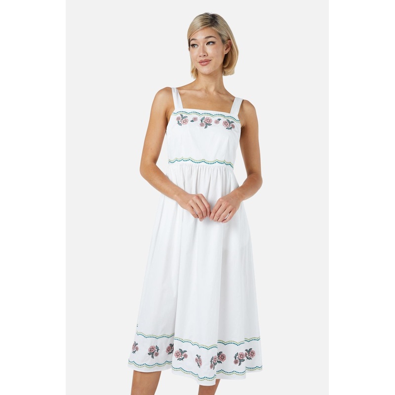 Cream midi sundress, embroidered with retro styled flowers & scallop details - fitted bodice - sleeveless style with wide shoulder straps - gathered skirt stye, midi length - invisible back zipper - made of a soft cotton - available in creamProduct Code: P