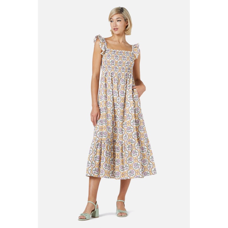 Midi length, sleeveless sundress, printed with a romantic 60s inspired flower geo & made of organic cotton- shirred bodice - ruffled shoulder straps - gathered skirt with deep hem ruffle - made of organic cotton - available in orange Product Code: PGFY160