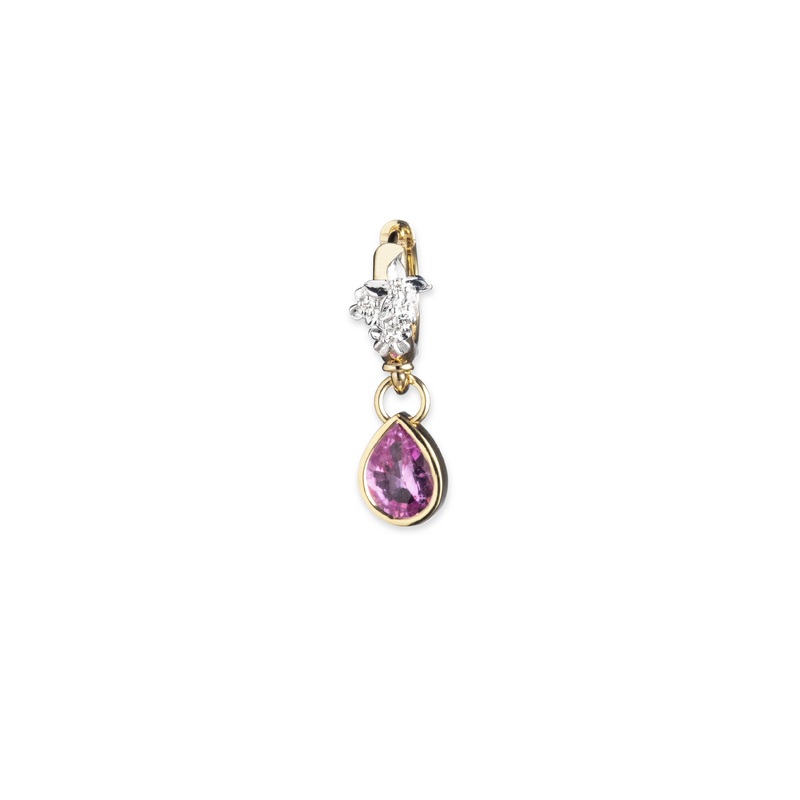 Handcrafted in 18k Yellow and White Gold, our Resilience Gemstone Ear Hoop features a 0.6 ct pear-cut pink tourmaline and symbolizes our True Love tenet, specifically a pairing in your life that just feels right. It could represent the love of a friend, lover, or family member who is now a part of your heart forevera pear for a perfect pair. The pendant embellishes our Blossom Hoop Earring, which symbolizes our Resilience tenet. Blossoms, the product of resilience, bloom in defiance of adversity with wild abundance.