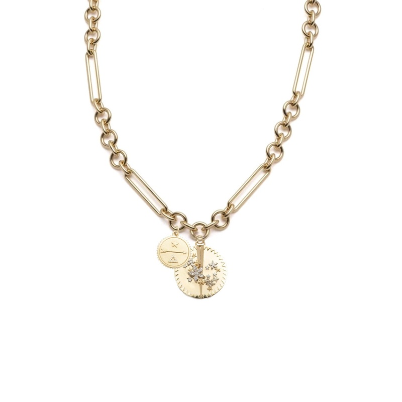 Handcrafted in 18-karat Yellow Gold, this Midsize Mixed Clip Necklace symbolizes Resilience. This necklace is sold with our Large Resilience Medallion at the base and complimented with our Dream Medium Medallion