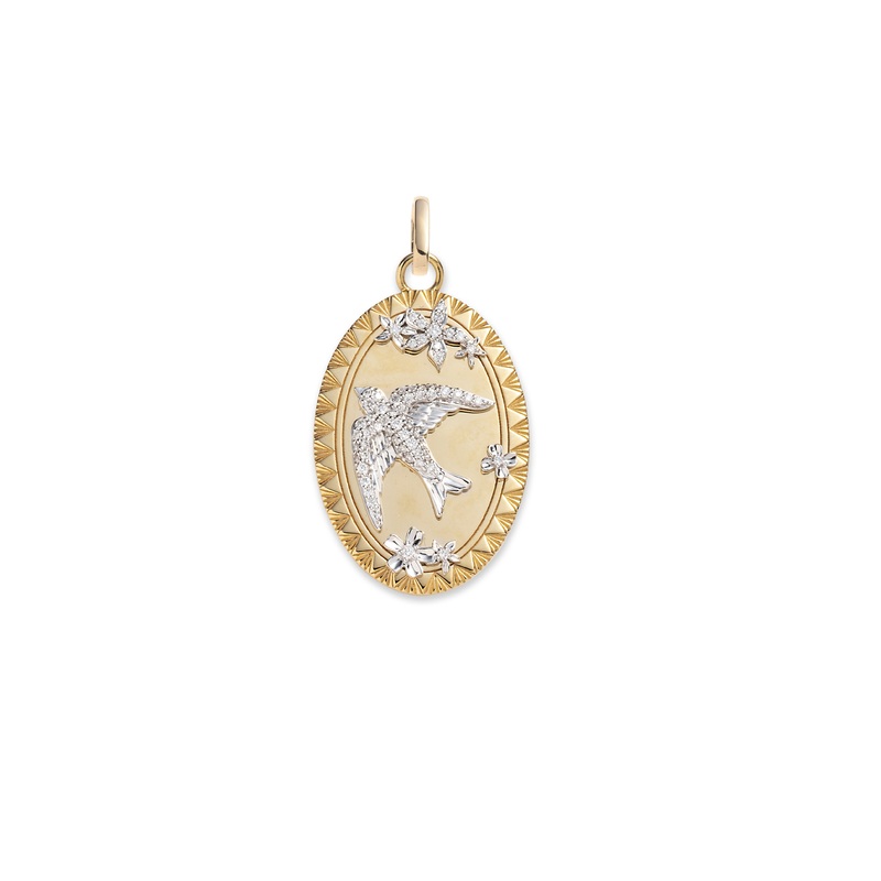 Handcrafted in 18k Yellow and White Gold with Diamonds, our Resilience Oval Medallion is part of our Resilience tenet. We chose the sparrow as a pictorial representation of its homophone spero, which means “I hope” in both Latin and Italian. The Latin phrase dum spiro, spero translates to “as long as I breathe, I hope”a reminder in times of adversity that the sparrow will sing again.
