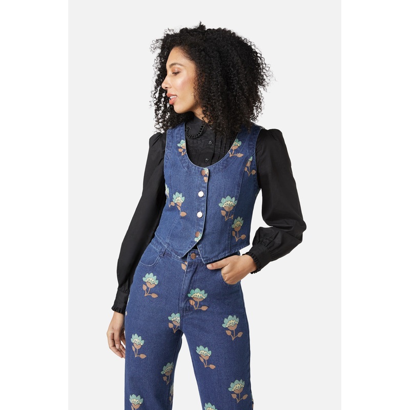 Retro printed denim vest- a 70's inspired patchwork repeat- layer over a blouse or knit top- fitted style with a round neckline- front button closure- pointed hem shaping- made of a denim cotton- available in dark denimProduct Code: PGFV440