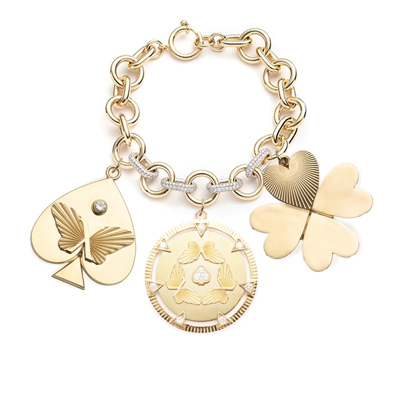Handcrafted in 18K Yellow Gold, oversized round links and oval links combine to form this mixed link bracelet that symbolizes Reverie. Sold with the Exuberant Reverie Oversized Medallion, Exuberant Spade Oversized Medallion, and the Oversized Four Heart Clover all soldered on the bracelet. Reverie means daydreaming; floating between reality, fantasy, and memory. Connect your conscious and unconscious. Seek out what lights you up. Seek what gives you energy. Elevated positive energy is the catalyst of change that allows us to reconnect and align with our souls to create joy. These symbols evoke, rather than just describe, Joy.