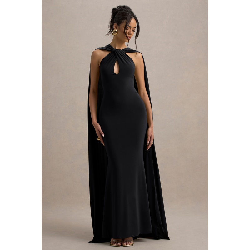 Rhoda | Black Twist Halter-Neck Cape Maxi Dress