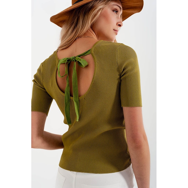 This green, fine-knit open-back bodycon sweater with short sleeves has a tie closure in the back, which provides a window to highlight your skin or even another top layered underneath on a chilly day. It is super soft because its made from 65% Viscose and