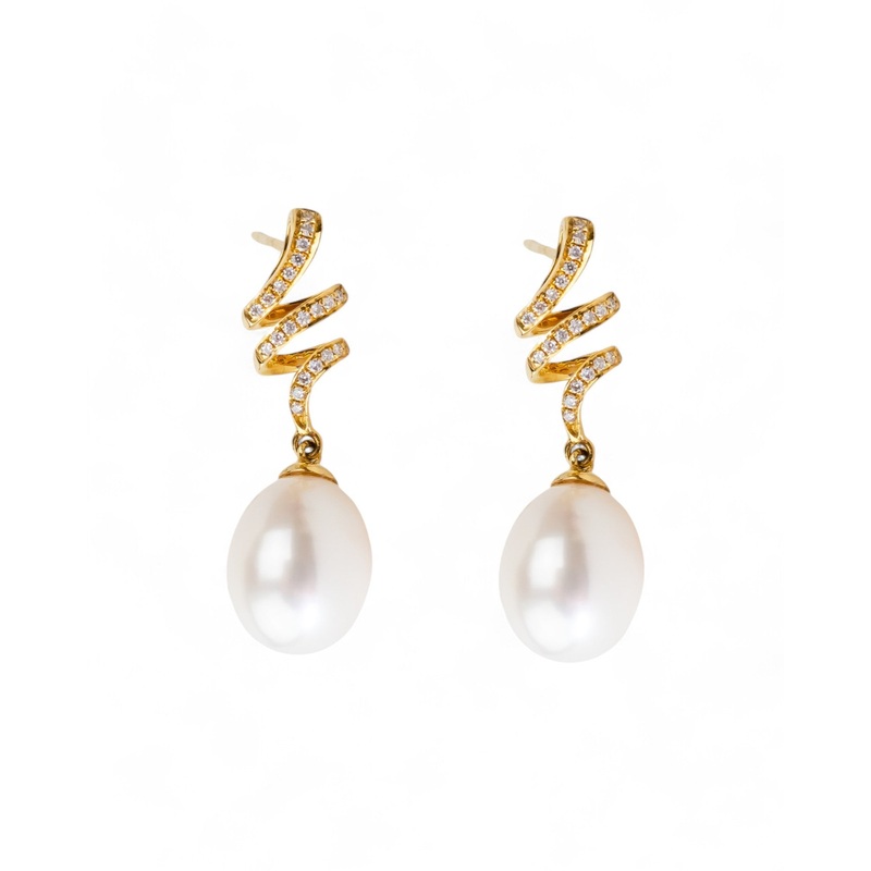 The Ribbon Pearl and Diamond Drop Earrings area unique and elegant expression of natural beauty and refined craftsmanship.Baroque Pearl Elegance: The freshwater baroque pearl takes centre stage as a symbol of organic beauty and individuality.Diamond Detail