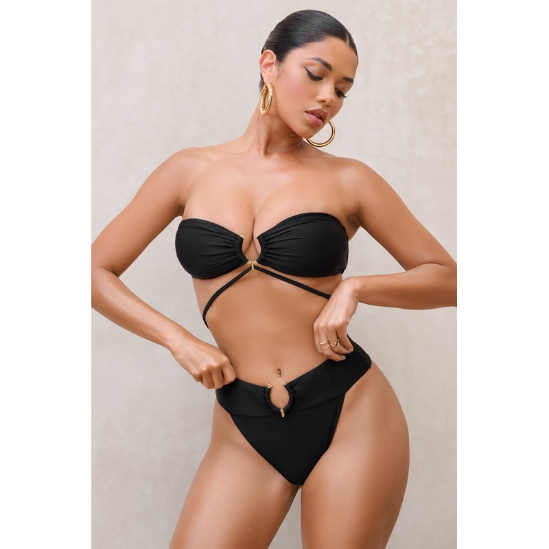 Bring envy to every beach sunbather in our latest pair of embellished bikini bottoms. Inspired by the high rising tides, Rises comes in a black nylon knit with a gathered waistband held by a gold-toned ring.Features- Premium nylon-blend knit- High rise- Ga
