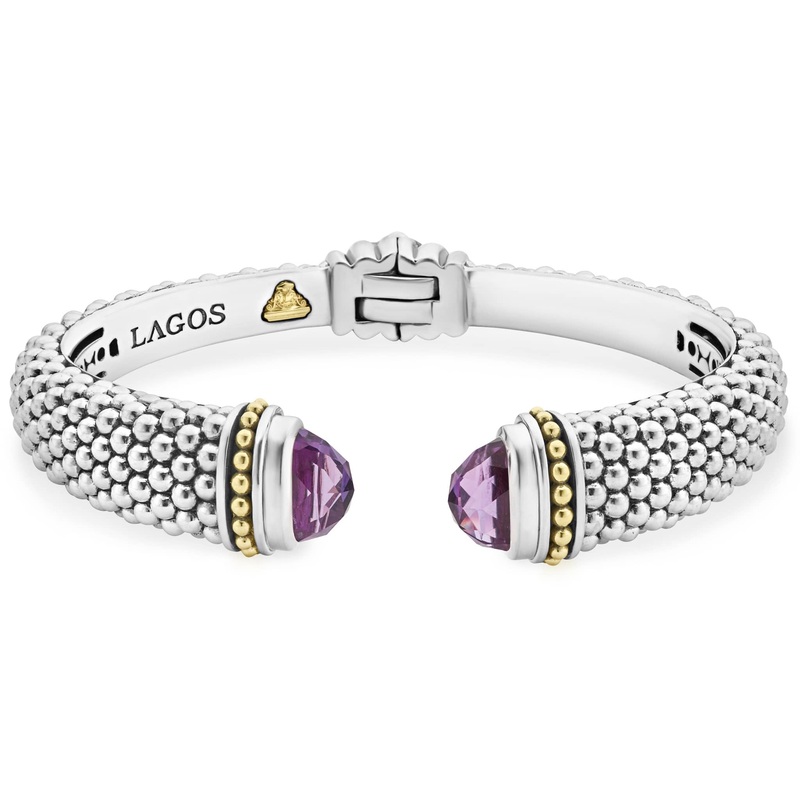 Expertly crafted Caviar beading with highly polished sterling silver stations comprise this innovative bracelet detailing amethyst gemstone end caps. Finished with a hinge clasp.