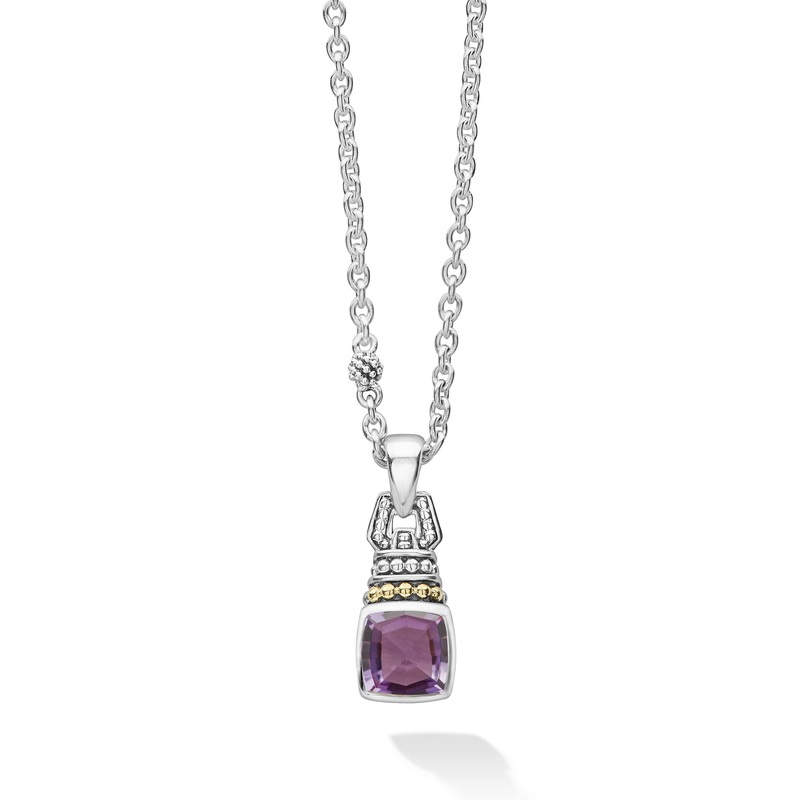 Amethyst gemstone drop pendant necklace with 18K gold and sterling Caviar beading. Necklace adjusts from 16 to 18 inches for added versatility.