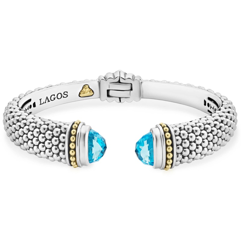 Expertly crafted Caviar beading with highly polished sterling silver stations comprise this innovative bracelet detailing swiss blue topaz gemstone end caps. Finished with a hinge clasp.
