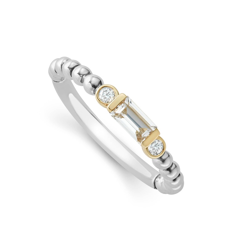 White topaz gemstone with diamonds form this stacking ring surrounded by 18K gold and sterling silver Caviar beading. diamonds are the highest quality natural stones.