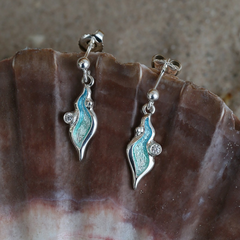 These small River Ripples drop earrings in sterling silver are each hand-set with a 2mm cubic zirconia and hand-enamelled in ‘Shallows’ enamel in our Orkney workshop. Each flowing ripple design drops from a sterling silver earring post and measures approximately 18mm long.
