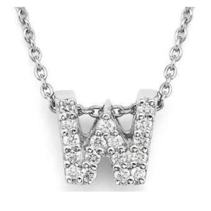 Roberto Coin 18K White Gold Tiny Treasures Diamond Love Letter “W” Necklace, D=.08ctw, 16/18″