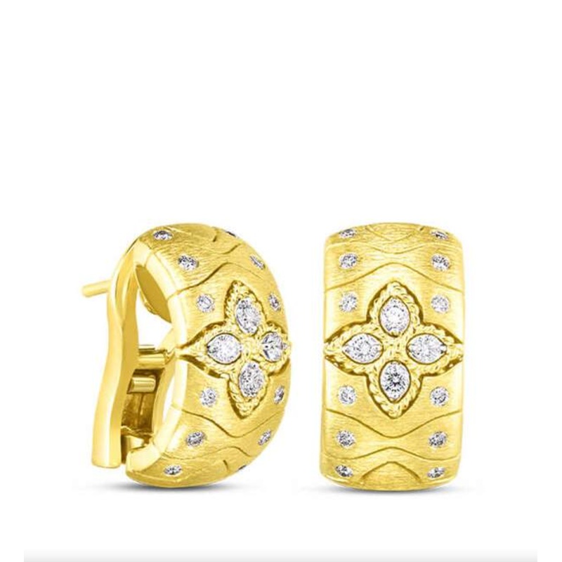 18 karat yellow gold Roberto Coin Royal Princess Flower and Satin Finish earrings containing 0.44 carat total of diamonds.