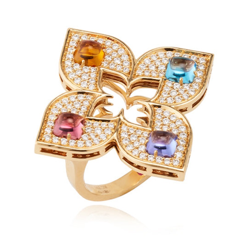 18K Yellow Gold Roberto Coin Venetian Princess Ring With Blue Topaz .05CTS, Citrine .04CTS, 2 Ruby .05CT – .01ct, Tanzanite .05CTS And Diamonds .35CTS.