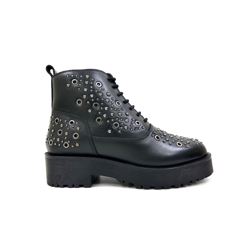 Capture a rock 'n' roll attitude sliding in this zip-up chunky bootiesfeaturing a decorative lace-up design, practical side zippers, non-skidplatform lug soles, and studded metal pebbles.Side zippersBack pull tabsLace-up designCushioned footbedStudy rubber