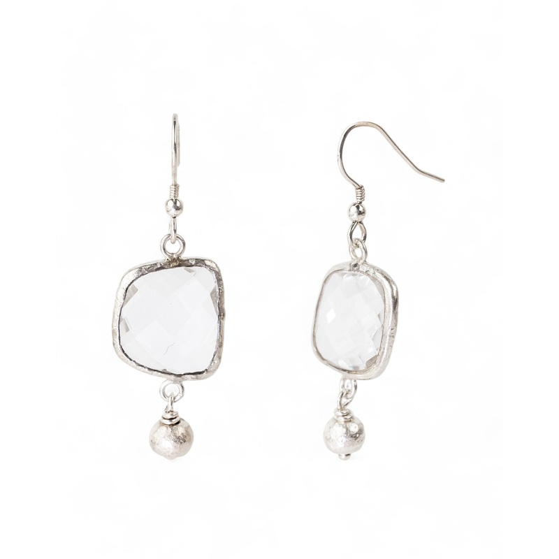The Rock Crystal Drop Earrings are handmade in sterling silver, with a distinctive hammered matte finish.