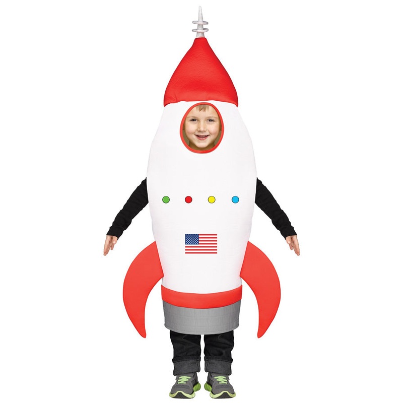 3...2...1... Liftoff!Explore the furthest reaches of the galaxy in this Rocket Ship Toddler Costume. The rocket shaped tunic features four buttons and the American flag printed on the front, two red fins at the bottom, and a silver nozzle at the top. Ready
