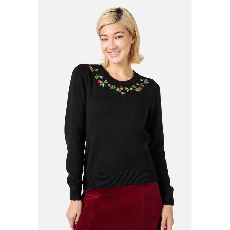 Black long sleeved knitted jumper. Embroidered with sweet red roses & green foliage- high round neckline- full length, long sleeve- ribbed hem, neckline & sleeve cuff- semi fitted knit style- made from an acrylic cotton blend- available in blackProduct Cod