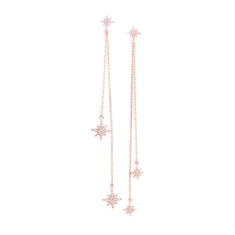 The Rose Gold Astral Earringsare made from 9ct rose gold andlab created white sapphires. The star shaped studs are connected to two star shaped pendants by fine cable chains.